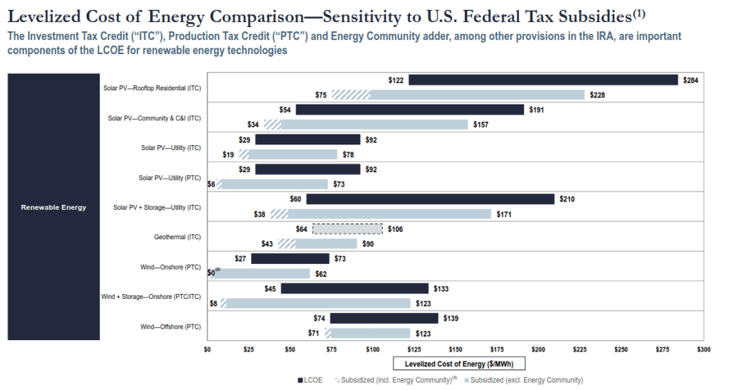 [PICTURE: LCOE bar chart showing overlapping ranges for utility solar, onshore wind, combined-cycle gas, peakers, etc., emphasizing that the output is a range, not a point.]